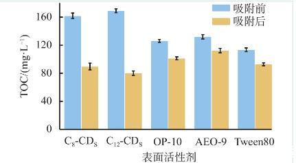 圖5兩親性碳點(diǎn)和聚氧乙烯型表面活性劑在吸附前后的TOC值(c=200 mg/L)