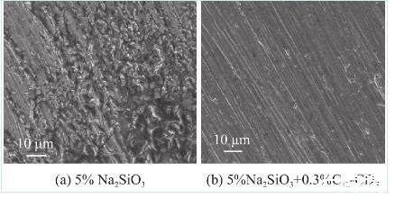 為研究?jī)捎H性碳點(diǎn)在硅酸鈉溶液中的摩擦學(xué)性能,利用SGW-10G型杠桿四球摩擦試驗(yàn)機(jī)測(cè)試,測(cè)試方法參照行業(yè)標(biāo)準(zhǔn)SH/T 0189—92《潤(rùn)滑油抗摩損性能測(cè)定法(四球機(jī)法)》,實(shí)驗(yàn)參數(shù)設(shè)置如下,用掃描電鏡(SEM)拍攝摩擦表面形態(tài)圖片并分析如圖7所示。