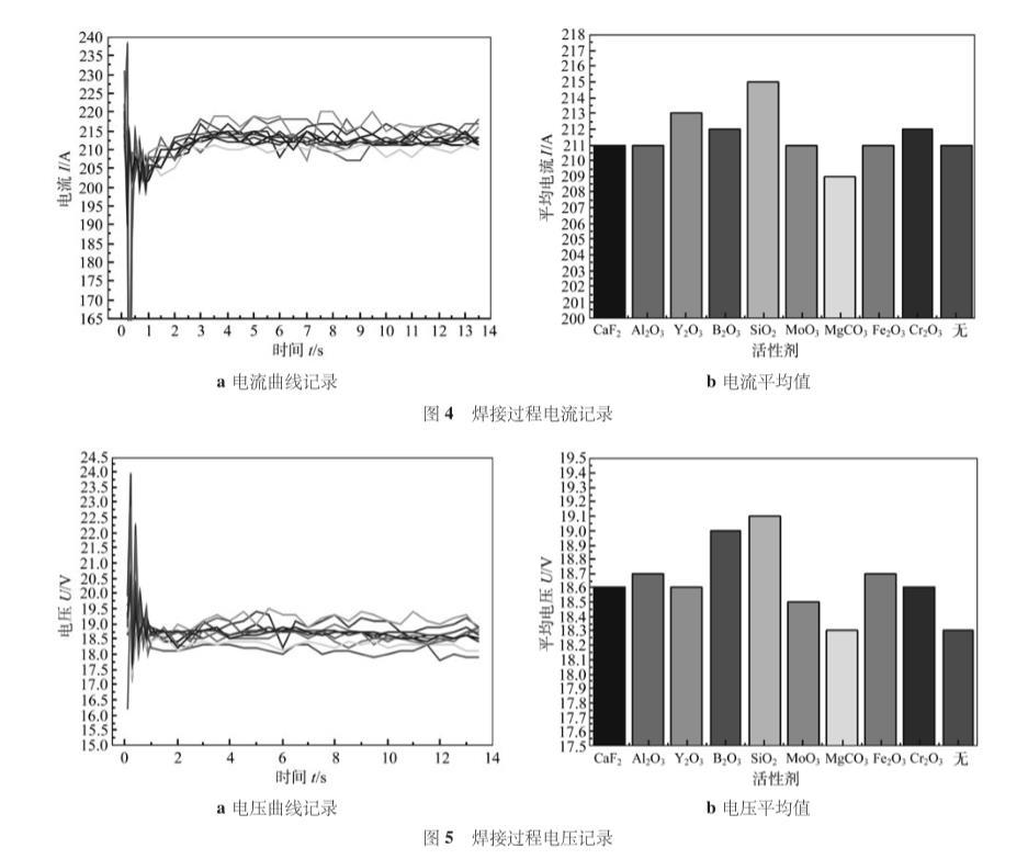 圖4為焊接過程中電流的記錄。從圖4a可以看出,焊接過程中各單一活性劑焊接電流曲線基本相似,從圖4b可以看出,大部分活性劑焊接過程的平均電流與無活性劑時相差不大,SiO2和MgCO3的電流平均值相比無活性劑時有較為明顯的變化,其中前者增加,后者減小。無活性劑時的平均電流達到211.5 A,而涂SiO2可以達到215 A。