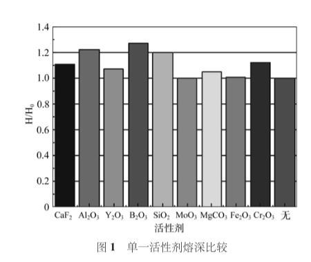 單一活性劑焊縫參數(shù)及無活性劑時焊縫參數(shù)如表2所示,表2單一活性劑焊縫參數(shù),圖1是單一活性劑熔深與無活性劑時熔深比直方圖。