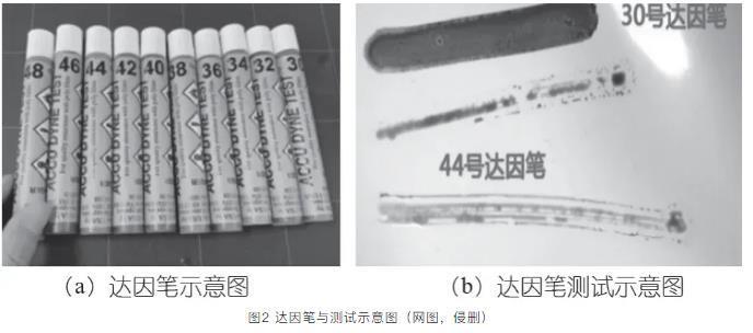 測試前先確定環(huán)境溫度、空氣濕度、以及被測物體表面溫度是否達到達因筆標定的標準條件(溫差越大,測量誤差越大)。測試方法圖2(b)所示塑料袋張力測試,當30mN/m筆測試時,在2 s內達因筆潤濕了基材表面,沒有收縮或分散情況,說明表面張力等于或大于30 mN/m;當44 mN/m筆測試時,在2 s內達因筆沒有潤濕了基材表面,出現收縮或分散水珠情況,說明表面張力小于44 mN/m。還可用大于30 mN/m筆測量,以此類推,直到測試結果在2 s內改縮成水珠(球狀),則這測試之前一次的值被視為基材表面能,并作比較用。塑料袋PP材質在溫度20℃時表面張力是31~33 mN/m。達因筆使用方便,保質期為6個月。
