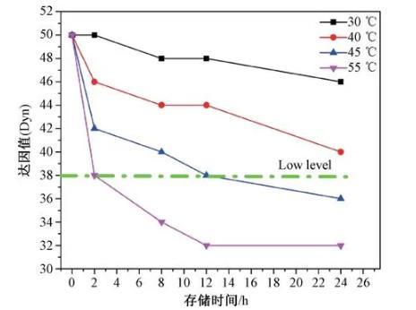 隨著保存時間的增長,背板的達因值也隨著逐漸降低。在低溫30℃下保存1d后達因值仍能達到48 mN/m,濕度越低,達因值下降越緩慢。溫度越高濕度越大,達因值下降越快。