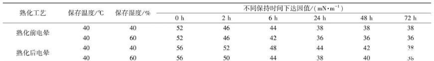 本文通過JMP軟件定制熟化前后電暈正交試驗設(shè)計,發(fā)現(xiàn)熟化溫度影響最顯著,熟化環(huán)境的濕度對耐候?qū)颖砻鎻埩τ绊懙诙@著,反應(yīng)程度第三顯著,電暈溫度無明顯影響。在40℃條件下,對熟化濕度進行單因素分析,控制熟化濕度低于40%,基本上能使耐候?qū)颖砻鎻埩_到38 mN/m。熟化后電暈與熟化前電暈相比,在相同的保存時間內(nèi),熟化后電暈達因值較大。