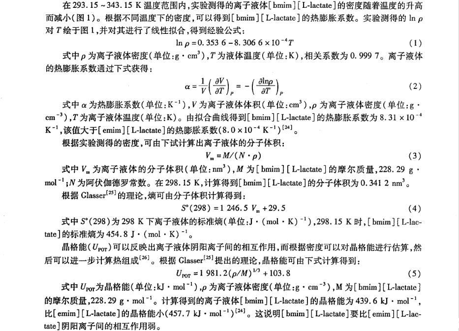 離子液體物理化學性質的研究對離子液體的設計和應用具有重要的指導作用,而對于離子液體與分子溶劑(例如水)的混合物性質研究將會揭示該類液體的新的應用。筆者在不同溫度下測定帶有手性陰離子的純離子液體1-丁基-3-甲基-咪唑乳酸鹽([bmim][L-lactate])及[bmim][L-lactate]+H2O二元混合物的密度和表面張力,并對其體積性質和表面性質進行研究。以期進一步豐富手性離子液體與分子溶劑二元混合物的物理化學性質數(shù)據(jù),為其應用提供更多的理論依據(jù)。