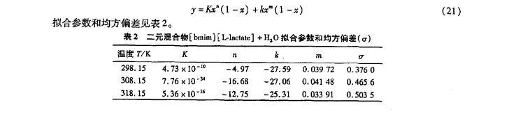 表2二元混合物[bmim][L-lactate]+H2 O擬合參數(shù)和均方偏差(σ)