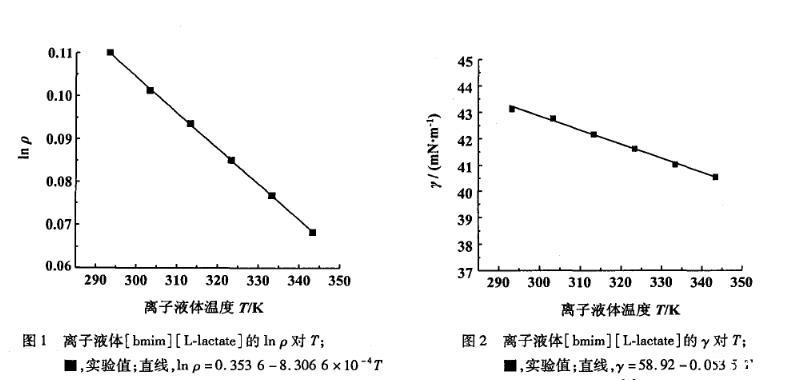 在293.15~343.15 K溫度范圍內(nèi)實(shí)驗(yàn)測(cè)得的離子液體[bmim][L-lactate]的表面張力值隨溫度的升高而減小(圖2),并且得到表面張力的經(jīng)驗(yàn)方程: