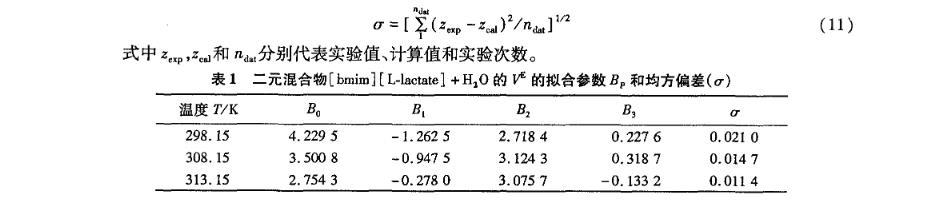 表1二元混合物[bmim][L-lactate]+H2O的V E的擬合參數(shù)BP和均方偏差(σ)