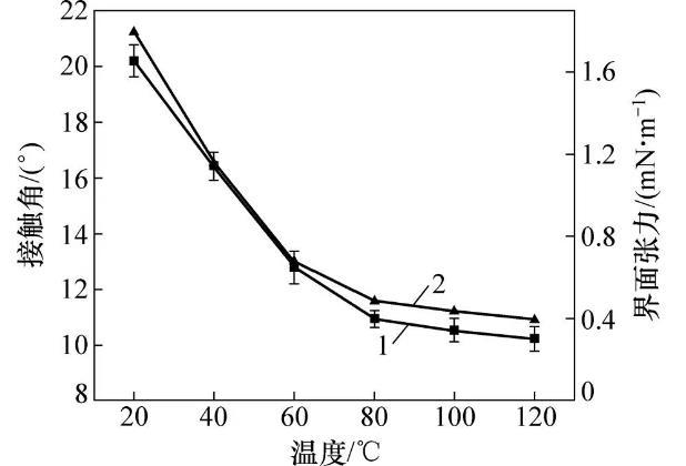 對(duì)20,40,60,80,100和120℃溫度下DBTL在CBT500光滑薄板上靜態(tài)接觸角進(jìn)行測(cè)量,結(jié)果如圖4所示。結(jié)合上述溫度下DBTL界面張力1(如圖3所示),將和1代入式(3),計(jì)算相應(yīng)溫度下DBTL與CBT500的接觸角法界面張力12,結(jié)果如圖4中界面張力所示。由圖4可知:隨著溫度升高,接觸角和接觸角法界面張力具有相同的下降規(guī)律,不同溫度區(qū)間內(nèi)下降趨勢(shì)不同,20~60℃溫度區(qū)間下降趨勢(shì)最大,60~80℃溫度區(qū)間下降趨勢(shì)次之,80~120℃溫度區(qū)間下降趨勢(shì)平緩。由Young方程可得cos=(2?12)/1,代入上述關(guān)系,即溫度升高,接觸角減??;除此外,不同溫度區(qū)間內(nèi),DBTL對(duì)CBT500初期誘導(dǎo)率不同,從而導(dǎo)致不同溫度區(qū)間內(nèi)靜態(tài)接觸角、界面張力下降趨勢(shì)不一致。
