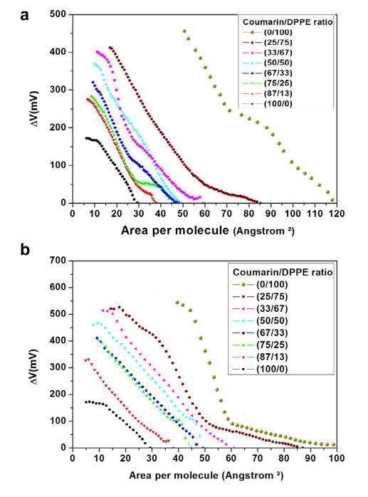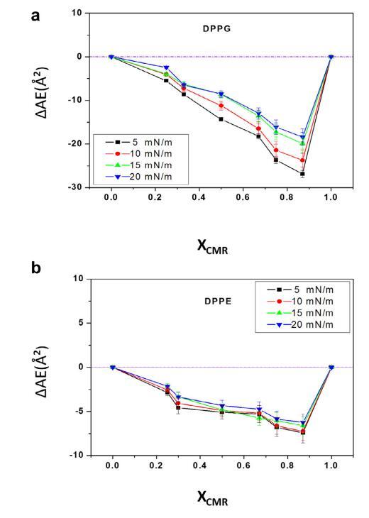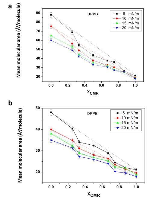 分子面積作為 CMR/ DPPG如圖5a所示。 可以看出負偏差 mma (XCMR = 0.33–0.67) 由于分子吸引力相互作用的增加。 CMR/DPPG 薄膜被認為是部分混溶和非理想的浮動單層,因為線性度不高 觀察到的。 CMR/DPPE 混合薄膜的結果在 XCMR=0.25 和 0.67 時表現出不同的斷裂點(圖 5b)。 DAE 節(jié)目 包裝效率甚至幾何形狀的改進 調節(jié)發(fā)生在較低的 XCMR(圖 6)(Andrade 等人, 2006; 周和張,2000)。