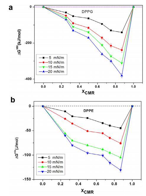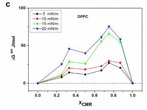 CMR/DPPG 混合膜的 ?Ge 和 ?Gmix 表示負 從 XCMR ≥ 0.25 到 XCMR = 1.0 的偏差(圖 7a 和 8a)。 ?Ge 和 ?Gmix 負值表明 CMR/DPPE 單層是 熱力學穩(wěn)定(圖 7b)。 ?Ge 和 ?Gmix 值為 DPPC 混合單層陽性,表明不混溶 (圖 7c 和 8c)。 分子之間的距離取決于 在導致排斥的磷脂頭部基團上 互動(邁爾斯,1999 年;博格斯,1987 年)。