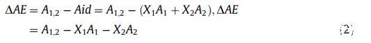 其中 A1,2 是 mma,Aid 是理想的混合單層,X1 和 X2 分別是組分 1 和 2 的摩爾分數。 A1 和 A2 是相同表面壓力下每分子純單分子層的相應面積。 DAE 值變?yōu)榱?當物質形成理想混合物或不混溶時 (瓊斯和查普曼,1996 年)。