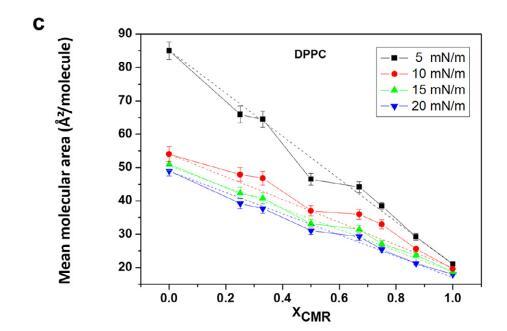 純和混合單層的 pA 等溫線與分子面積的關系如圖 1 所示。CMR/DPPG 等溫線顯示出與純 DPPG 脂質相似的趨勢(圖 1a)。 相似相 對所有 CMR/DPPG 混合物都觀察到了轉變。 DPPG 和 DPPC 顯示崩潰壓力 (DPcoll) 為 52 mN.m-1 次方和 60 mN.m-1次方 , 分別。 一個過渡 (p ffi 3 mN.m-1次方 ) 從液體 發(fā)現純 DPPE 單層膨脹為凝聚相 與 D. coll 在 ffi55 mN.m-1次方 . 為 D. coll 獲得的值 純脂質與文獻一致(Vollhardt 等人, 2000; 諾沃塔斯卡等人,2014 年)。