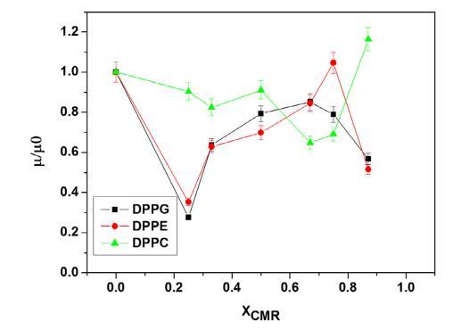 作為函數分子面積 (ΔVA) 的表面電位為 如圖3a所示。 為所有研究的磷脂獲得的 ?V 值 與之前的報告相似(Andrade et al., 2006; Nowotarska 等,2014)。 ?V(460 mV 至 275 mV)逐漸降低 對于 DPPG,觀察到 CMR 摩爾分數的函數。 ?V 易受極性和非極性基團的取向影響。
