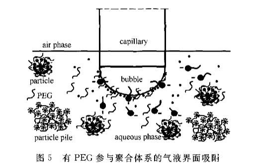 由圖3可見,有PEG參與的聚合體系。5rain的DST與圖2相比變化起伏較大,有先低后急升再緩降的變化模式,與一般的DST呈單調(diào)減小的趨勢有很大不同。這是因?yàn)樵诜磻?yīng)剛開始體系中除了單體、齊聚物和膠粒,又增加了PEG,而且PEG與齊聚物、膠粒作用形成粒子堆口]。PEG是完全水溶性物質(zhì),在體系水相中的濃度遠(yuǎn)遠(yuǎn)大于單體和齊聚物,但擴(kuò)散速率要小于單體及齊聚物,因此一開始部分新形成的氣液界面會由擴(kuò)散速率最快的單體迅速占領(lǐng),而隨時(shí)間推移PEG借助濃度優(yōu)勢會替代單體占據(jù)氣液界面,如圖5所示,最終達(dá)到平衡,由單體、齊聚物和PEG共同覆蓋整個(gè)氣液界面。PEG水溶液的氣液界面張力要比單體的氣液界面張力大得多,因此在水相中有大量單體存在的情況下,此聚合體系的DST會出現(xiàn)先低后急升的曲線形狀。這個(gè)狀況會一直持續(xù)到30rain時(shí),可以看出,PEG使體系直到30min時(shí)仍有大量游離單體存在于水相,而無PEG參與的體系此時(shí)已無單體游離在水相中。這一點(diǎn)可以從圖6轉(zhuǎn)化率一時(shí)間曲線得到證實(shí),無PEG參與的體系30min時(shí)已接近聚合終點(diǎn),而有PEG參與的體系轉(zhuǎn)化率才只有25左右。待反應(yīng)至50min時(shí),DST趨勢平穩(wěn),水相中游離的單體已經(jīng)很少,此時(shí)轉(zhuǎn)化率在49左右,說明單體已基本進(jìn)入到膠粒中。這個(gè)狀態(tài)一直維持到60min時(shí)。75min時(shí)的體系有很大變化,從宏觀看粒徑發(fā)生轉(zhuǎn)變,由大變小。從DST曲線看氣液界面張力明顯提高,轉(zhuǎn)化率已快速增加到95,接近終點(diǎn)。此時(shí)體系中對DST的貢獻(xiàn)主要以脫離粒子堆的成熟粒子l3和PEG為主。