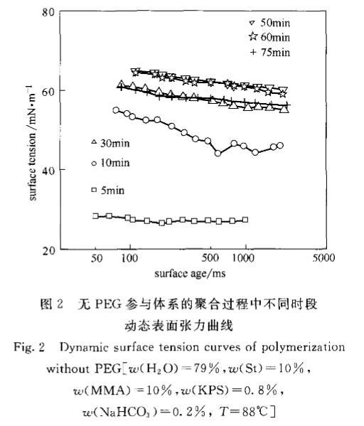 2.2聚合時(shí)間對動態(tài)表面張力變化趨勢的影響經(jīng)引發(fā),水相中溶解的單體聚合成鏈,聚合體系的組分也隨之發(fā)生變化。體系在水相中含有了自由基齊聚物,以及由齊聚物聚集形成的基本粒子或膠束。這些新產(chǎn)生的物質(zhì)對DST曲線有很明顯的影響,加上PEG與聚合物鏈的相互作用,則使DST曲線有更多的變化。為了能明確地分析PEG在聚合過程中的作用,進(jìn)行了有PEG和無PEG參與的聚合體系各時(shí)間段動態(tài)表面張力實(shí)驗(yàn)比較。圖2和圖3分別為St/MMA在無PEG的水中和有PEG的水溶液中DST隨聚合時(shí)間的變化趨勢。
