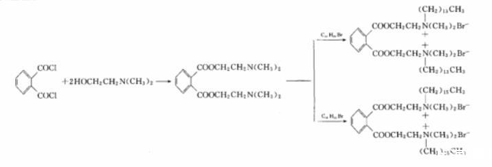 雙子(gemini)型表面活性劑比傳統(tǒng)表面活性劑有更多優(yōu)良性能:更高的表面活性,更低的Krafft點和更好的水溶性;在降低水的表面張力方面表現(xiàn)出更高的效率。Gemini表面活性劑近年來已成為國內(nèi)外膠體和界面化學(xué)的研究開發(fā)熱點和重點。但現(xiàn)有一些雙子表面活性劑降解能力較差,使其應(yīng)用受到限制。因此開發(fā)對環(huán)境無危害、易生物降解、高效多功能的環(huán)境友好型表面活性劑已成為人們共同關(guān)心的話題之一。從分子結(jié)構(gòu)而言,酯基和酰胺基是易于自然降解的基團(tuán),如今含有酯鍵或酰胺鍵的表面活性劑的合成及性能研究逐漸成為研究熱點。本文在前人研究的基礎(chǔ)上采用N,N-二甲基乙醇胺與鄰苯二甲酰氯反應(yīng)得到二(二甲基胺基乙基)鄰苯二甲酸酯,然后二鄰苯二甲酸酯再分別與正溴代十六烷和正溴代十四烷反應(yīng),經(jīng)反應(yīng)和處理得到雙季銨基鄰苯二甲酸酯基表面活性劑SHZ16和SHZ14,在制取得到產(chǎn)物后,對它們的性能進(jìn)行測定并作對比研究。