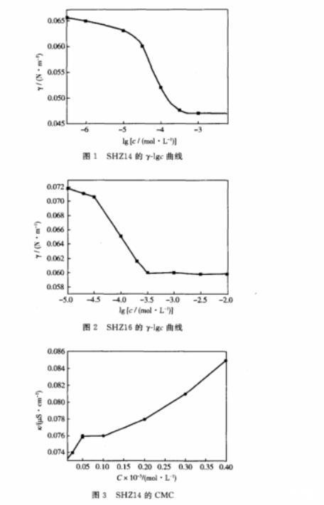 b.SHZ16的臨界膠束濃度為比SHZ14要低,這是由于SHZ16的碳?xì)滏湵萐HZ14稍長,導(dǎo)致疏水基之間的相互干擾減少,造成在表面的自組織能力增強(qiáng),表面吸附能力有所升高,從而使臨界膠束濃度降低。