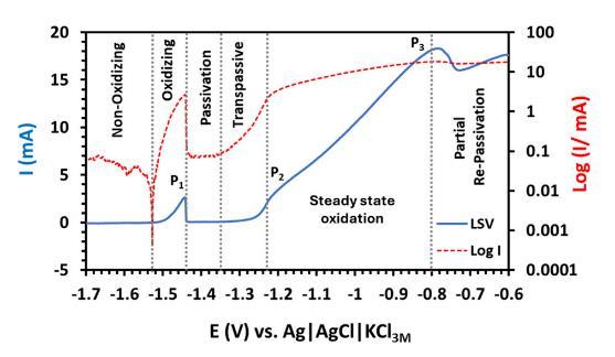 圖1電化學(xué)線性掃描伏安圖(LSV,藍(lán)色實(shí)線)及液滴電流的對(duì)數(shù)圖(紅色虛線),針對(duì)1 M NaOH中的鎵銦合金,掃描速率為0.5 mV/s。垂直虛線將圖中標(biāo)記的六個(gè)反應(yīng)區(qū)域區(qū)分開(kāi)來(lái),標(biāo)記出三個(gè)氧化峰P1、P2和P3。