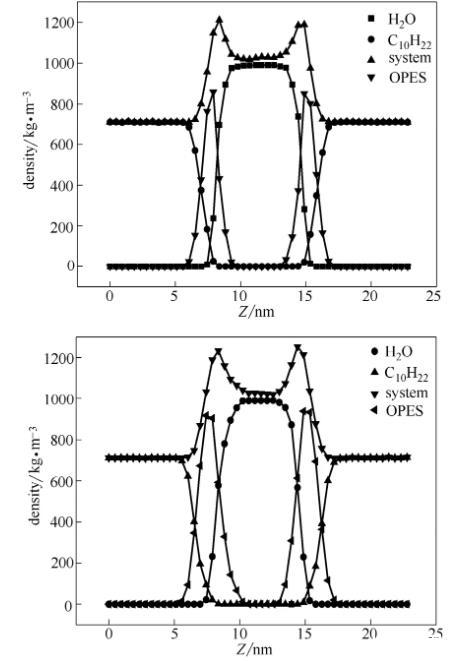 本文提取體系穩(wěn)定的S80、S120進(jìn)行分析,兩個(gè)體系的各部分密度圖如圖4所示。在平衡狀態(tài)下兩體系中水的平均密度分別為989.86 kg·m-3、992.43 kg·m-3,與國(guó)際溫標(biāo)318 K時(shí)水密度990.2 kg·m-3值接近;另外,兩體系中癸烷平均密度為711.49 kg·m-3、710.72 kg·m-3,與真實(shí)狀況下癸烷密度711.2 kg·m-3值接近,這表明模擬體系的模型選擇、力場(chǎng)參數(shù)都是準(zhǔn)確的,可以得出可靠結(jié)論。