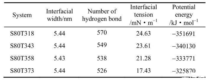 表2通過界面張力、表面活性劑與水的氫鍵數(shù)量、勢(shì)能3組數(shù)據(jù)對(duì)比得出表面活性劑的界面張力隨著溫度升高而降低的結(jié)論。數(shù)據(jù)表明在4組模擬實(shí)驗(yàn)過程中,界面的寬度并沒有發(fā)生改變。因此界面張力下降的主要原因是由于OPES勢(shì)能的降低導(dǎo)致分子之間的作用力也隨之降低。