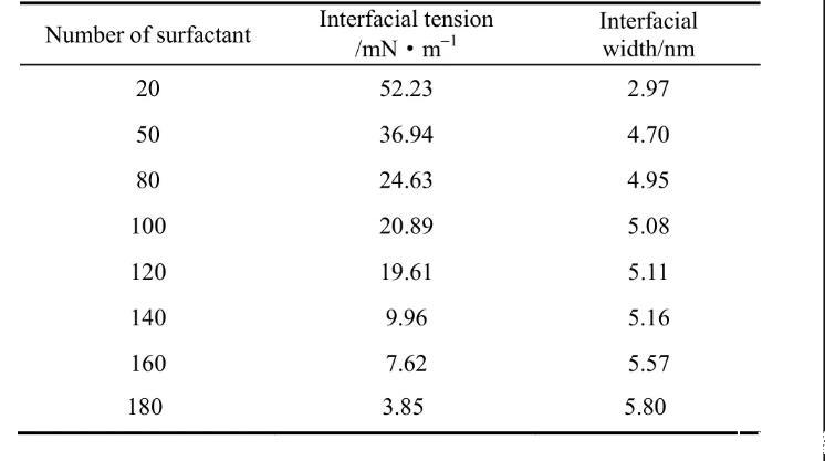 從表1可以發(fā)現(xiàn)表面活性劑數(shù)量的增加使得界面張力逐漸下降。其中當(dāng)OPES數(shù)量由20增加到80時(shí),界面張力值較高,這說明當(dāng)表面活性劑濃度較低時(shí)并不能起到很好的降低界面張力的作用;隨著表面活性劑數(shù)量進(jìn)一步增加界面張力逐漸下降,當(dāng)OPES數(shù)量為180時(shí),達(dá)到臨界飽和狀態(tài),此時(shí)界面張力僅為3.85 mN·m-1,此變化規(guī)律與真實(shí)實(shí)驗(yàn)規(guī)律相同。這同時(shí)也說明辛基酚聚氧乙烯醚磺酸鹽可以很好地降低界面張力,是一種性能優(yōu)良的表面活性劑。界面寬度用體系密度圖中表面活性劑的密度曲線寬度來表示。隨著表面活性劑個(gè)數(shù)增加界面寬度遞增,起初界面寬度增加速度較快是因?yàn)榻缑鍻PES濃度過低并未飽和;當(dāng)OPES數(shù)量達(dá)到100~140時(shí),界面寬度僅有少量緩慢增加這是由于此時(shí)界面正在逐漸接近飽和狀態(tài)。隨著OPES的數(shù)量達(dá)到160和180時(shí),界面寬度增加幅度變大,進(jìn)一步驗(yàn)證此時(shí)界面已達(dá)到飽和狀態(tài)。