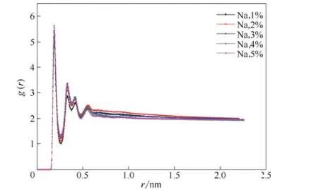 圖7在不同Na+濃度體系中磺酸基中的氧原子與水中氫原子的徑向分布函數(shù)