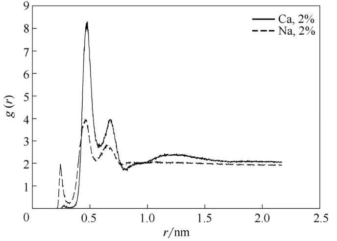 圖10中曲線分別代表在2%NaCl溶液、2%CaCl2溶液中磺酸基中的氧原子與水中氫原子之間的徑向分布函數(shù),如圖所示兩條曲線的峰值并未有太大差別,這說明OPES對(duì)Na+、Ca2+都有很好的抗鹽性。