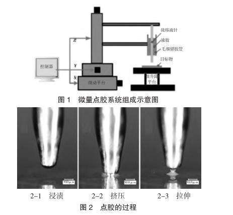 本課題組研制了一種基于移液針轉印原理的微量點膠系統(tǒng),該點膠系統(tǒng)所形成的膠斑直徑可達到數十微米,膠滴體積可達飛升-皮升的范圍。該系統(tǒng)的結構如圖1所示。該系統(tǒng)由出膠單元、驅動單元和控制單元組成。其中,出膠單元為系統(tǒng)的核心,其主要包含微移液針和毛細儲膠管兩個關鍵元件,移液針通過在儲膠管內的上下往復運動,實現(xiàn)膠液向基板的微量轉移。驅動單元由X/Y/Z三個方向的驅動電機和微升降平臺組成,用于驅動微移液針及點膠工件的運動??刂茊卧蒔LC控制系統(tǒng)和LaBview開發(fā)的控制面板組成,實現(xiàn)對電機運動的自動控制。