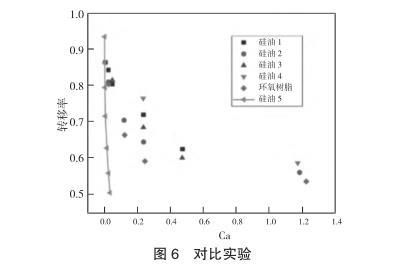 對不同黏度以及拉伸速度下的膠液進行測量并計算轉移率,如圖4所示,在忽略慣性力的條件下,采用無量綱數Ca來表示轉移率,對于表面張力相似且不同黏度的四種甲基硅油的轉移率有著相似的收斂情況。為了進一步印證Ca對轉換率的影響,引入與甲基硅油不同表面張力的環(huán)氧樹脂進行對比實驗,如圖5所示,表面張力較大的環(huán)氧樹脂的轉換率會比甲基硅油小,但整體趨勢相差不大,均會收斂到一定數值。之后,為了了解慣性力對轉移率的影響,選擇黏度較小的膠液進行實驗,同時加大移液針直徑使其脫離微量點膠的范圍,以提高慣性力對膠液傳遞的影響,如圖6所示,在通過增加膠液體積以提高慣性力影響的實驗中,膠液轉移率的變化與之前有極大差異。