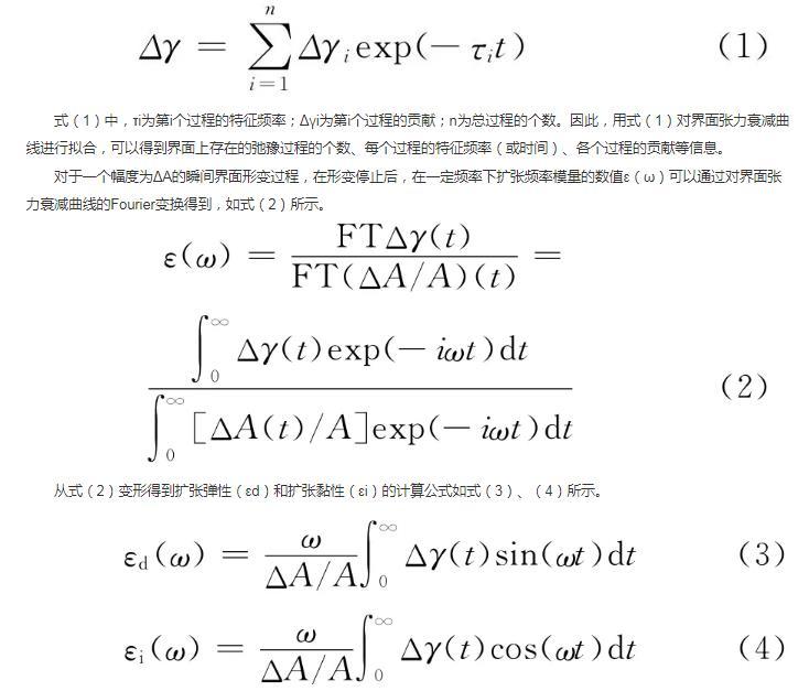本研究中采用界面張力弛豫法,通過對(duì)受擾動(dòng)界面張力衰減曲線擬合獲得界面張力改變量隨時(shí)間變化的函數(shù)關(guān)系,再經(jīng)過Fourier變換,計(jì)算得到界面擴(kuò)張參數(shù)的全頻率譜,從而獲得界面上活性分子行為的信息。
