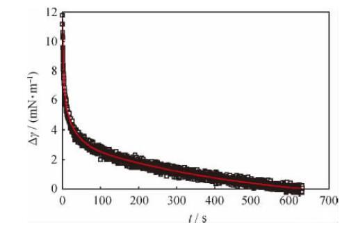 當(dāng)活性分子界面吸附膜達(dá)到平衡時(shí),對(duì)其實(shí)施一個(gè)突然的擾動(dòng),則界面上各活性分子均會(huì)對(duì)此擾動(dòng)產(chǎn)生響應(yīng)。界面和體相間分子交換的快慢、分子在界面上排列的變化、分子間相互作用的強(qiáng)弱等信息均會(huì)反映在擾動(dòng)停止后的界面張力衰減曲線上。典型的界面張力(Δγ)衰減曲線及其擬合曲線如圖1所示。