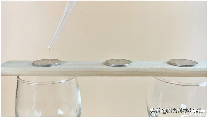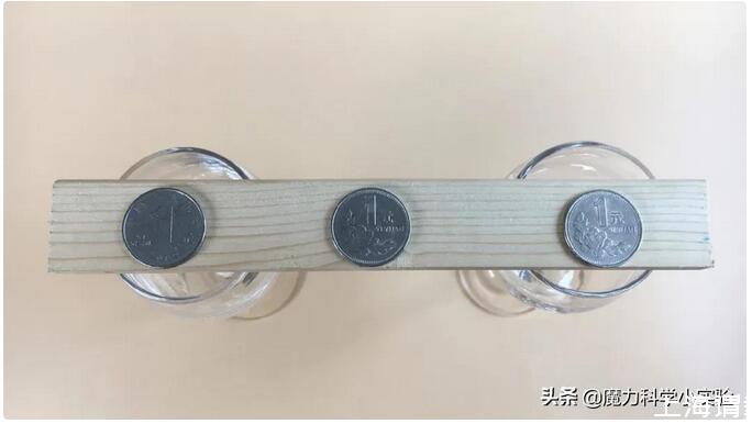 1.用兩只玻璃杯架起小木片,三枚硬幣并排擺放在小木片上。
