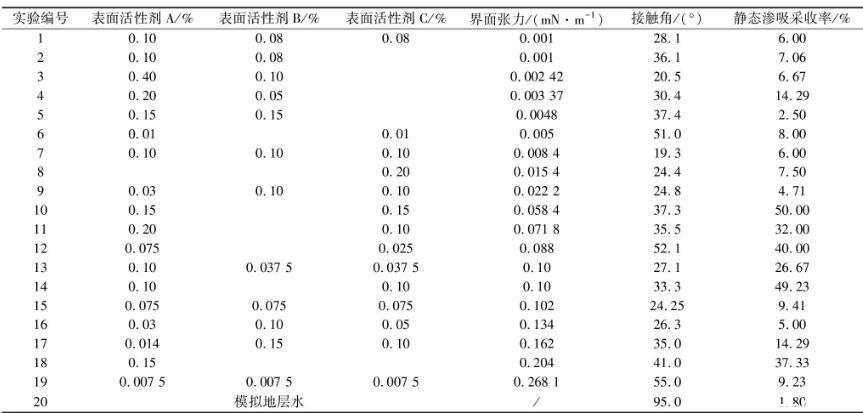 根據(jù)國內(nèi)外學者的研究,滲吸液對滲吸的影響主要是改變油水界面張力、潤濕性、乳化性和pH值。乳化性主要是通過乳化分散,從而增強油滴在巖心孔道內(nèi)的流動能力;pH值則主要是影響滲吸液的乳化能力。本次實驗采取靜態(tài)滲吸的方式,乳化性的作用相對較小,故滲吸液配制指標為界面張力與潤濕性。