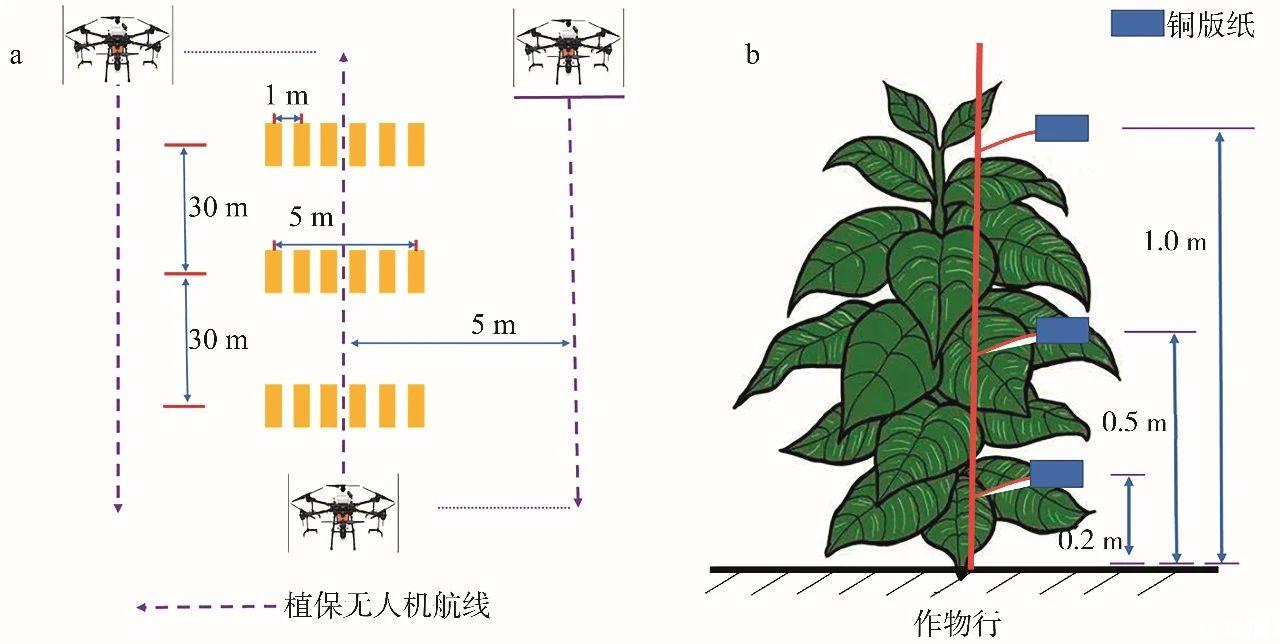 試驗時無人機采用常規(guī)往復施藥模式進行噴霧作業(yè),各條航線之間間隔為5.0 m,試驗地塊開闊無遮擋,且煙草長勢較為一致。試驗前,在各處理小區(qū)中間地帶布置3排間隔為30.0 m的霧滴采集帶,每條霧滴采集帶含6個霧滴采集點,每個采集點間隔1.0 m,總長度5.0 m(圖1a)。每個霧滴采集點處插一根采樣桿,用雙頭夾將銅版紙固定在采樣桿上。設置上、中、下3層采樣位置,分別距地面1.0、0.5和0.2 m(圖1b)。用于測定煙草上、中、下冠層的霧滴密度和覆蓋率。噴霧結束后,待銅版紙上的霧滴自然晾干后收取并裝入自封袋帶回實驗室。
