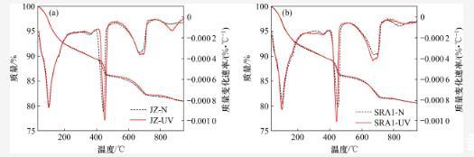 通過TG-DTG程度對比分析60 d齡期時2種環(huán)境條件下水泥水化,熱重分析結(jié)果圖6和表4所示?;瘜W(xué)結(jié)合水和氫氧化鈣的含量可以直觀地反映水化速率和水化程度。如表4所示,經(jīng)過強(qiáng)紫外線照射后,各組樣品的化學(xué)結(jié)合水含量和氫氧化鈣含量呈下降趨勢,這是因?yàn)閺?qiáng)紫外線照射下樣品中的自由水會更快地蒸發(fā),最終導(dǎo)致水化程度降低。此外,對比2種環(huán)境下的碳酸鈣含量發(fā)現(xiàn),強(qiáng)紫外輻射會促進(jìn)水泥石的碳化。熱重分析結(jié)果與已有的研究結(jié)果相似。