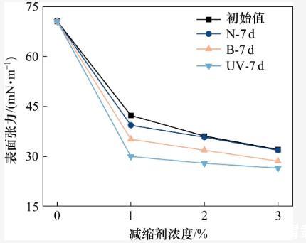 據(jù)以往研究,SRA在水泥基材料表面的吸附率通常在10%以下,90%以上的SRA分子溶于溶劑中(包含吸附在氣液界面上的部分)。因此,SRA減縮的理論基礎(chǔ)主要是毛細(xì)管張力理論。為了進(jìn)一步探索減縮劑在強(qiáng)紫外線輻射環(huán)境下的作用機(jī)理,測試了減縮劑溶液的初始表面張力,以及溶液經(jīng)過3種不同環(huán)境(N,UV,B)處理7 d后的表面張力。試驗(yàn)結(jié)果如圖8所示。