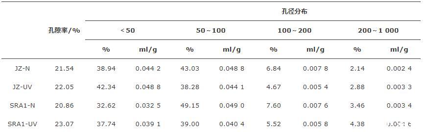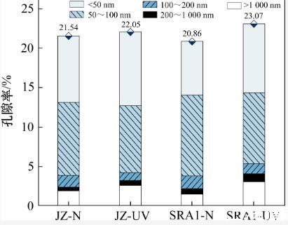 由圖7和表5可以看出:強(qiáng)紫外線輻射使各組樣品的總孔隙率、介孔率(2~50 nm)及大孔率(尤其是200 nm以上的孔)增加,由于彎月面的表面張力效應(yīng),介孔的毛細(xì)管產(chǎn)生更高的毛細(xì)管應(yīng)力,導(dǎo)致暴露在強(qiáng)紫外輻射環(huán)境中的水泥石產(chǎn)生更大的干燥收縮。同時,經(jīng)過強(qiáng)紫外線照射后,樣品中大于200 nm的孔隙比例增加。這是由于強(qiáng)紫外線輻射環(huán)境下,水泥凈漿的水化程度降低及水分散失增加導(dǎo)致的。