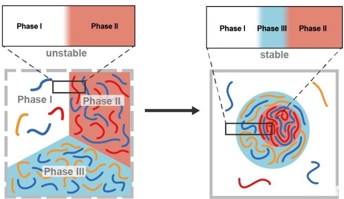 有別于簡單兩組分(聚陰離子與聚陽離子)體系,多組分聚電解質(zhì)體系會發(fā)生多相復(fù)合凝聚而出現(xiàn)共存的多個凝聚相,它們形成嵌套型或串珠型等各種多級分層結(jié)構(gòu),這些結(jié)構(gòu)的形成與生命體系中的分子定位、定向招募相關(guān),也是蛋白質(zhì)翻譯和核仁應(yīng)激反應(yīng)的結(jié)構(gòu)基礎(chǔ)。決定凝聚物體系采取何種多級液滴結(jié)構(gòu)的關(guān)鍵因素正是不同共存相間的界面張力。因此,深入研究多相凝聚體系的界面張力具有非常重要的價值。當前理論僅處理簡單兩組分體系形成的稀相與濃相間的界面,多相分離體系的界面張力尚未得到解決。