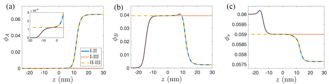 圖2.I-II相界面處的物種濃度分布曲線與I-III相界面和II-III相界面的濃度分布曲線對比。藍色實線為I-II相界面的濃度分布曲線,左側(cè)為I相,右側(cè)為II相;紅色點線I-III相界面的濃度分布曲線,左側(cè)為I相,右側(cè)為III相;黃色虛線為II-III相界面的濃度分布曲線,左側(cè)為III相,右側(cè)為II相。
