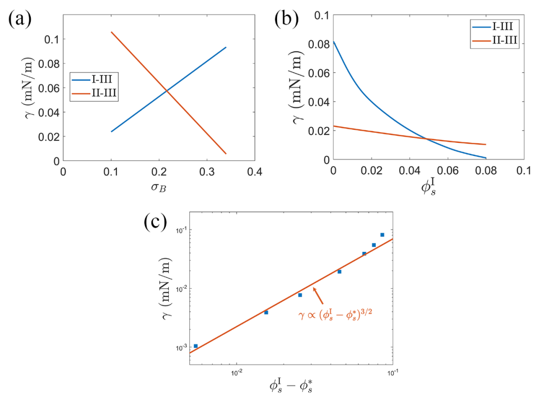 圖1.(a)I-III相與II-III相間的界面張力隨B鏈線電荷密度σB變化的曲線。(b)I-III相與II-III相間的界面張力隨外加鹽離子濃度變化的曲線。(c)接近臨界鹽時I-III相界面張力與鹽濃度之間的標度關(guān)系。