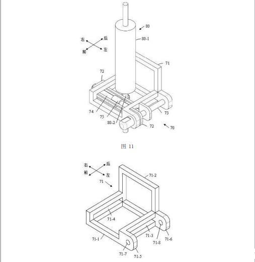 如圖12所示,固定座71整體呈L形,固定座71包括座體部71-1和背體部71-2,座體部71-1和背體部71-2均整體呈長方形,座體部71-1為閉合的環(huán)狀框體結構且位于水平面內(nèi),背體部71-2為U形框體結構且位于豎直面內(nèi),背體部71-2的下端與座體部71-1的后邊框固定連接使得二者整體呈L形,并且背體部71-2與座體部71-1的后邊框形成一個閉合的環(huán)狀框體結構。座體部71-1的左邊框包括上下設置的兩根棱柱,該兩根棱柱相互平行且二者之間設置有第一方孔71-3;座體部71-1的右邊框包括上下設置的兩根棱柱,該兩根棱柱相互平行且二者之間設置有第二方孔71-4;第一方孔71-3和第二方孔71-4均沿前后方向延伸。座體部71-1的左邊框的左側(cè)面(即外側(cè)面)上固定設置有第一延伸板71-5和第二延伸板71-6,并且第一延伸板71-5和第二延伸板71-6分別位于座體部71-1的左邊框的前后兩端,第一延伸板71-5上設置有沿前后方向延伸的通孔71-7,第二延伸板71-6上設置有沿前后方向延伸的通孔71-8。