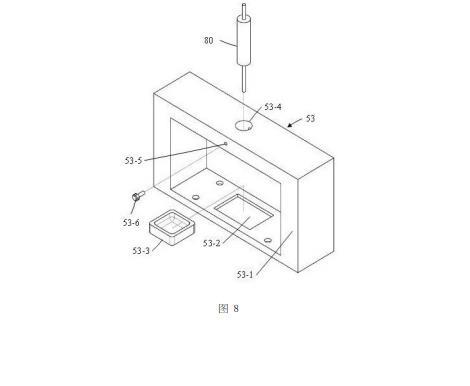 如圖8所示,第三窗形件53的第三邊框部53-1的下邊框上設置有一個例如長方形的凹坑53-2,并且沿左右方向凹坑53-2位于第三邊框部53-1的中間位置,凹坑53-2內(nèi)設置有一個積液盆53-3。第三窗形件53的第三邊框部53-1的上邊框上設置有一個例如圓形的第三通孔53-4,第三通孔53-4沿豎直方向延伸,并且第三通孔53-4位于凹坑53-2的正上方;注射器80包括主體管80-1和固定設置于主體管80-1下端面的針管80-2,主體管80-1和針管80-2均為內(nèi)部中空的圓形管,并且針管80-2的直徑小于主體管80-1的直徑,針管80-2與主體管80-1的內(nèi)部空腔相連通;注射器80的主體管80-1固定設置于第三通孔53-4內(nèi),并且針管80-2的末端剛好與攝像機61的中心軸線(即光源62的中心軸線)相交。在本實施例中,第三窗形件53的第三邊框部53-1的上邊框的側(cè)面設置有一個沿前后方向延伸的第一螺紋孔53-5,并且第一螺紋孔53-5與第三通孔53-4相連通;螺栓53-6設置于第一螺紋孔53-5內(nèi),螺栓53-6的外螺紋能夠與第一螺紋孔53-5相嚙合,并且螺栓53-6的里端能夠與注射器80的主體管80-1外壁相抵接,從而使得注射器80的主體管80-1固定設置于第三通孔53-4內(nèi)。