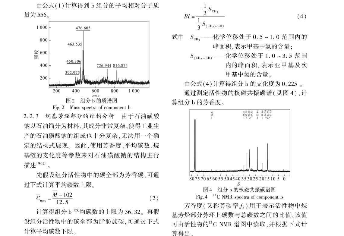 通過(guò)測(cè)定活性物的核磁共振碳譜(見(jiàn)圖4),計(jì)算組分b的芳香度。
