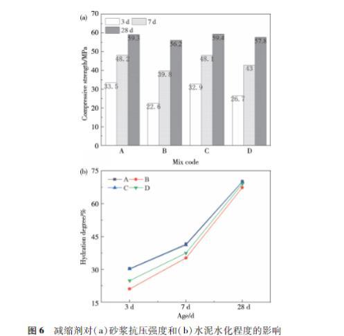圖6減縮劑對(duì)(a)砂漿抗壓強(qiáng)度和(b)水泥水化程度的影響