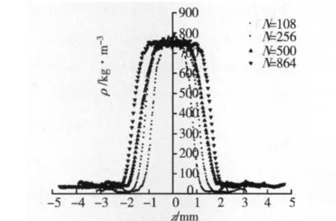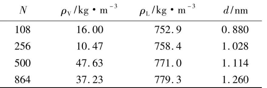 在溫度500 K和截?cái)喟霃絩c=0.9498 nm的條件下,當(dāng)模擬分子數(shù)N=108、256、500和864時(shí),模擬得到的密度分布見圖9。統(tǒng)計(jì)得到的汽相主體密度ρV、液相主體密度ρL及汽液界面厚度d見表5。