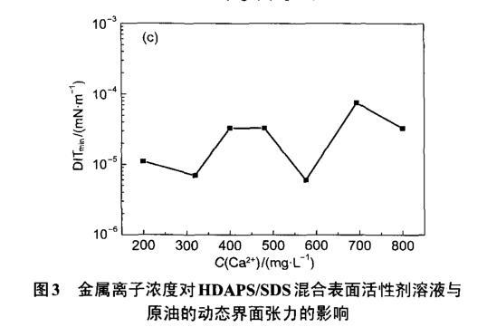 圖3金屬離子濃度對HDAPS/SDS混合表面活性劑溶液與原油的動(dòng)態(tài)界面張力的影響