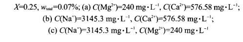 配制溶液所用的是高礦化度且含有高濃度二價(jià)金屬離子的模擬礦化水,從上面的實(shí)驗(yàn)結(jié)果中看出,HDAPS/SDS混合體系在高鹽條件下可以與原油達(dá)到超低界面張力??紤]到在實(shí)際應(yīng)用過程中地層水的礦化度可能發(fā)生變化,恒定模擬水中Na+、Mg2+和Ca2+中兩種金屬離子的濃度,考察了Na+、Mg2+和Ca2+濃度變化對HDAPS/SDS混合體系與原油界面張力的影響,實(shí)驗(yàn)結(jié)果如圖3所示。從圖中可以看出,模擬水中Na+濃度在1500-4500 mg·L-1、Mg2+濃度在120-360 mg·L-1和Ca2+濃度在200-800 mg·L-1范圍內(nèi)變化時(shí),HDAPS/SDS混合體系與原油的界面張力均可達(dá)到超低界面張力,這說明在高礦化度和高濃度二價(jià)金屬離子條件下,HDAPS/SDS混合體系也表現(xiàn)出非常優(yōu)異的界面活性。