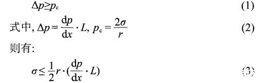 第三,HDAPS/SDS混合體系的動(dòng)態(tài)界面張力達(dá)到超低界面張力的時(shí)間非常短,且能夠在極低的平衡界面張力下維持。由于在實(shí)際驅(qū)油過程中,驅(qū)油體系是在流動(dòng)的狀態(tài)下與原油接觸,在短時(shí)間內(nèi)達(dá)到超低界面張力,對原油從巖石上啟動(dòng)非常有利。而且,HDAPS/SDS混合體系與原油的界面張力在總濃度超過0.04%后就可以達(dá)到極低的10-5mN·m-1量級(jí)。對于存在于半徑為r的毛細(xì)管中長度為L的剩余油滴,當(dāng)油滴兩端的驅(qū)動(dòng)壓差Δp大于等于毛細(xì)管壓力pc時(shí),剩余油滴才能夠活化啟動(dòng),7即有: