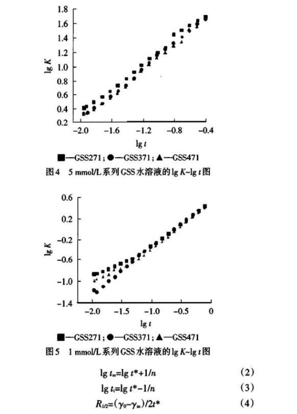 測得的DST數據經公式(1)處理后,令lgK表示lg[(γ0-γt)/(γt-γm)],以lgK對lgt作圖,結果見圖4~5。從直線的斜率與截距可以得到DST的特性參數n與t*值,并可根據公式(2)~(4)進一步得到誘導區(qū)結束時間ti、介平衡開始時間tm及t1/2時表面張力下降速率R1/2,結果見表2。