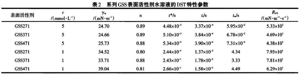 以GSS271為例,濃度越高,表面活性劑分子的擴散推動力越大,于氣液界面吸附越快,DST下降越顯著,因而誘導區(qū)結束的時間越早,越易達到介平衡,這與γm、ti、tm較小吻合;t*值隨濃度增大而減小,表明吸附后期勢壘隨濃度增大而增大,因為濃度較高時,更多的GSS271分子吸附于表面,由于空間位阻、分子間靜電斥力的影響,阻礙了新的GSS271分子吸附,吸附勢壘變大。濃度高時,R1/2大,動態(tài)表面活性好。